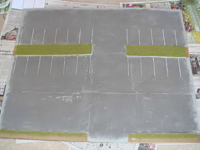 Hiekan kiinnittäminen niin, että se näyttää asfaltilta, olikin hankalampaa kuin ensin oletin, sillä kun hiekan levitti suoraan maalin pintaa ja yritti telata sitä kiinni, niin pinnasta tahtoi tulla kovin epätasainen. Kokeilin myös spray liiman käyttöä, mutta sitä ei todellakaan voi suositella, sillä lopputuksena oli lattian pesu, koska liima levisi huomattavan laajalla alalle suojauksista huolimatta. Lopullinen silaus saatiin aikaa lakalla.