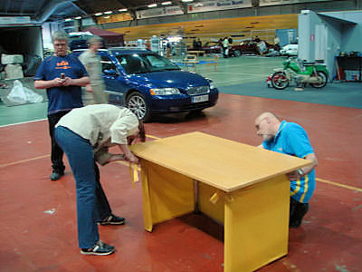 Osaston takaseinälle piti vielä keksiä jotain, sillä vaikka tarjolla olisi ollut sama banderolli kuin viime vuonna, niin nyt se ei oikein sopinut kokonaisuuteen. Onneksi Jarmo oli kysellyt lipun teettämistä kerholle ja vaikka aikataulu taisi olla valmistajalle hieman tiukka, niin se kuitenkin saatiin ajoissa. Itseasiassa isoin työ taisi olla kerhon logon piirtäminen uudelleen vektorigrafiikkana, jotta kuvasta tuli selkeä isossa koossa. Tarjolla olleista pikkukuvista olisi suurentamalla saanut vain suttua. Seuraavissa kuvissa näkyy, miten kerhon osasto muodostui. | |