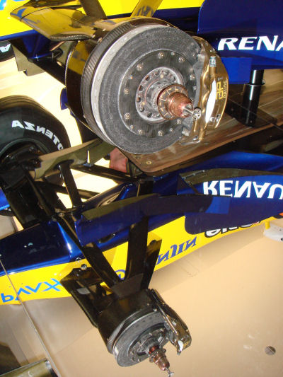 Kuvassa voi tutustua jarruratkaisuihin. Peilin päällä seisovan auton pohjaa pääsee myös tutkimaan varsin mukavasti ja siellä on hyvin nähtävässä myös puinen pohjalevy. |