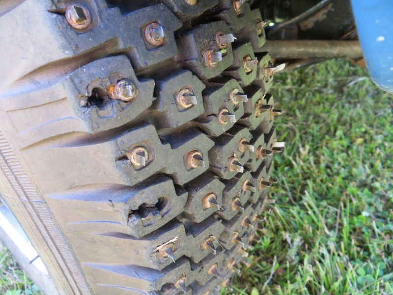 Alempana kuva kunnon piikkirenkaista, jotka autossa oli alla.