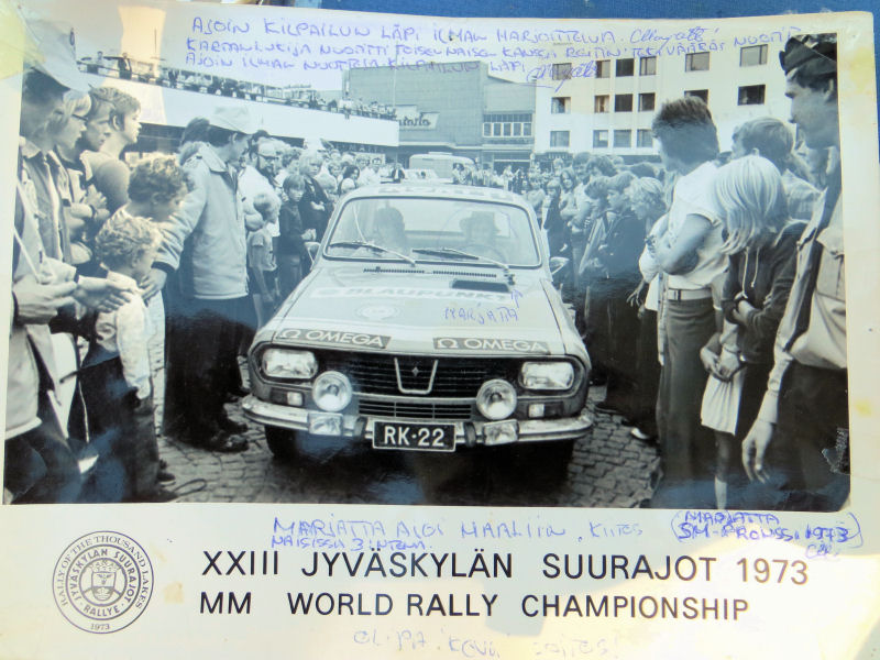 Alla pari kuvaa Jyväskylän suurajoista vuodelta 1973. Toisessa auto on jo maalissa. Marjatta oli naisista kolmantena.