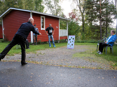 Ohjelmassa oli erilaisia tehtäviä. Kuvassa tarkoitus on saada erimittaisia ketjun pätkiä reijästä läpi. Toisilta tämä sujui paremmin kuin allekirjoittaneelta.