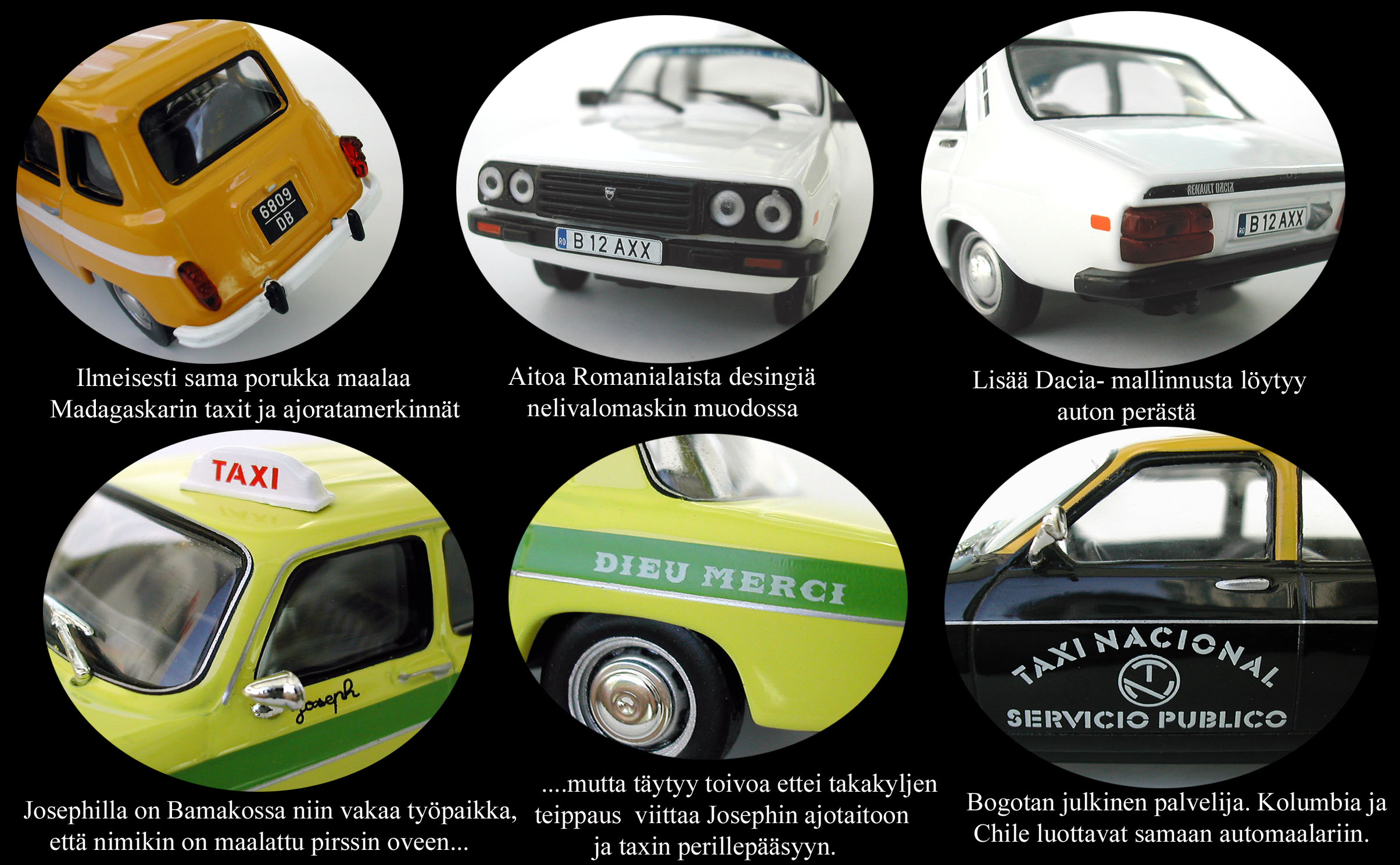 Dacian tunnusmerkit on saatu erittäin hyvin esiin käyttämällä muutamia erillisosilla. Siitä tehtaalle kiitos, nyt auto näyttää siltä kuin sen kuuluukin ja vaikkei esikuva nyt niin huipputuote ollutkaan, sen pienoismalli on kuitenkin hieno ja varsin harvinainen lisä Renaultin pienoismallikokoelmaan. Tuttuun peruskoriin on vaihdettu mm. mustat puskurit, uudemmat mustat taustapeilit sekä lasinpyyhkimet. Eräs hyvä Dacia-tunniste löytyy takaa, jonne on laitettu uudemman R12 mallin isot takavalot, mutta kori on silti vanhempaa mallia. Vanhan korin tuntee C-pilarien ilmanpoistoaukoista, joten tässä mallissa Altaya on ihan oikeasti nähnyt vaivaa. Mallista löytyy myös oranssit äärivalot. Ne on tehty teipillä ja lienevät myös alkujaan täysin paikallinen keksintö.