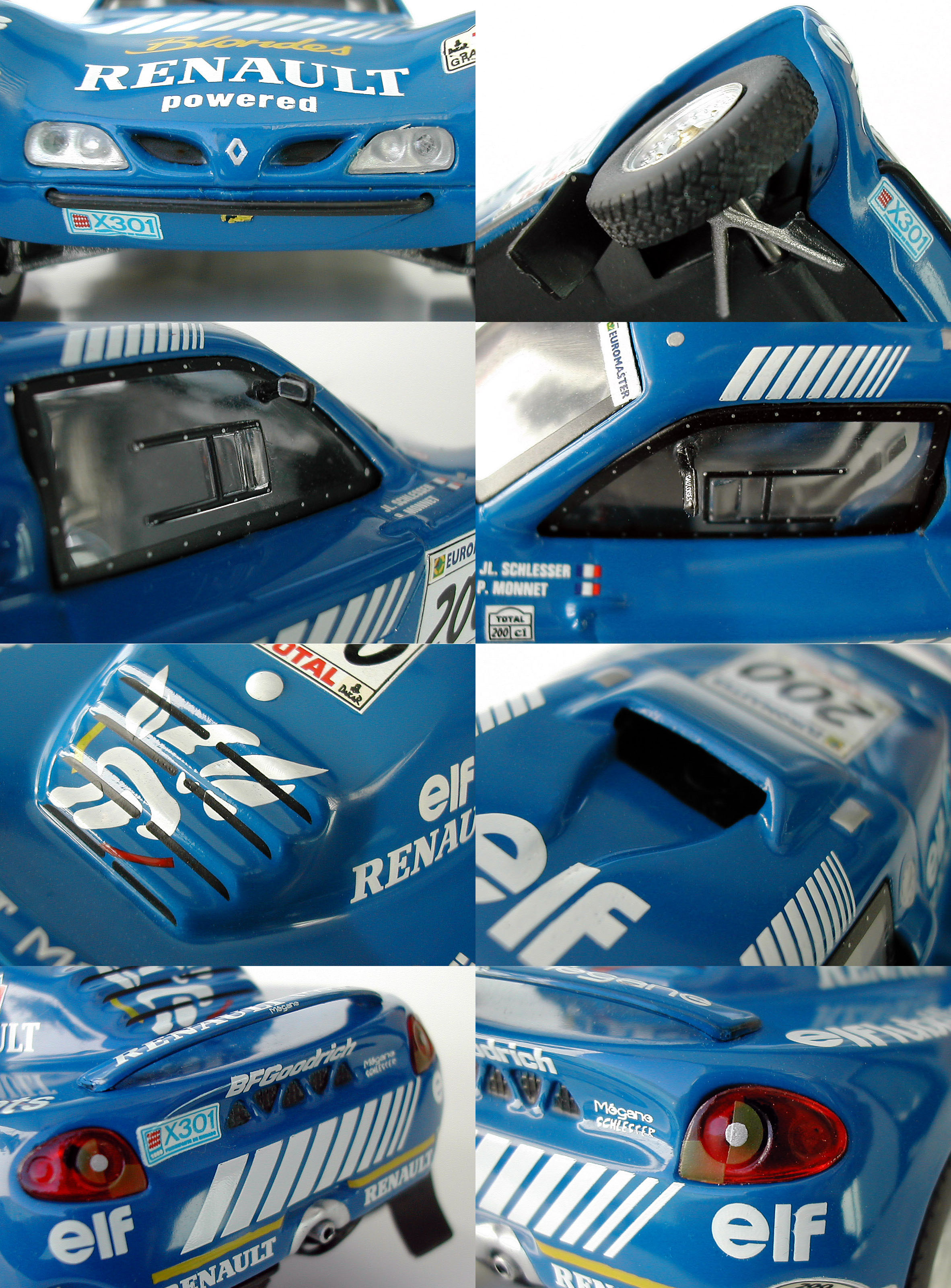 Tästä mallista ei taida olla kioskiautoa, mutta JLS voitti Dakarin myös seuraavana vuonna ja siitä autosta on jostain syystä montakin versiota liikkeellä. Tuo vuoden 2000 Megane ei juurikaan eroa koriltaan tästä versiosta, mutta siitä tehdyt pienoismallit eroavatkin sitten toisistaan todella paljon. IXO on tehnyt siitäkin tällaisen vastaavan mallin, valikoimista löytyy lisäksi tiimin toisen kuskin, Servian auto ja kolmas vaihtoehto on tietenkin kioskiauto, joskaan se ei ole pikkuosiltaan ihan yhtä tarkka kuin viralliset IXO-mallit. Norev on myös tehnyt kolme eri mallia, ilmeisesti ainakin yksi on taas kioskimalli, mutta sitähän nettihuutokauppiaat eivät mielellään kerro, Norev kun kuulostaa kalliimmalta. Yksi niistä on puhdas ja kiiltävä perusmalli, kahden ollessa valmiiksi "likaisia" eli kyljet ovat saaneet kunnon kuraefektit. Noreveissa on outoa se, että teippaus ja kuran määrä poikkeavat keskenäänkin toisistaan, en tiedä miksi, enkä lähtenyt asiaa sen enempää penkomaan. Se on kokonaan eri juttu, mutta sellaisiakin siis on saatavana, mikäli joku nyt alkaa metsästää itselleen tällaista mallia. | |